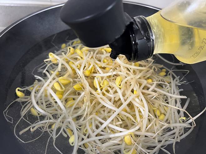 끓는 물에 콩나물을 넣은 다음 식용유 1~2 방울 떨어뜨려 주세요. 식용유를 넣고 삶으면 비린내가 제거되고 아삭한 식감이 유지됩니다.