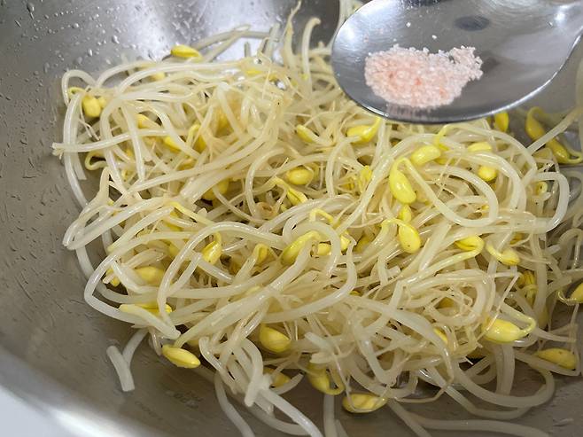 저는 콩나물무침 할 때 소금으로만 간을 합니다. 맛소금과 일반 소금을 각각 1/2 작은 스푼 넣어 주세요.