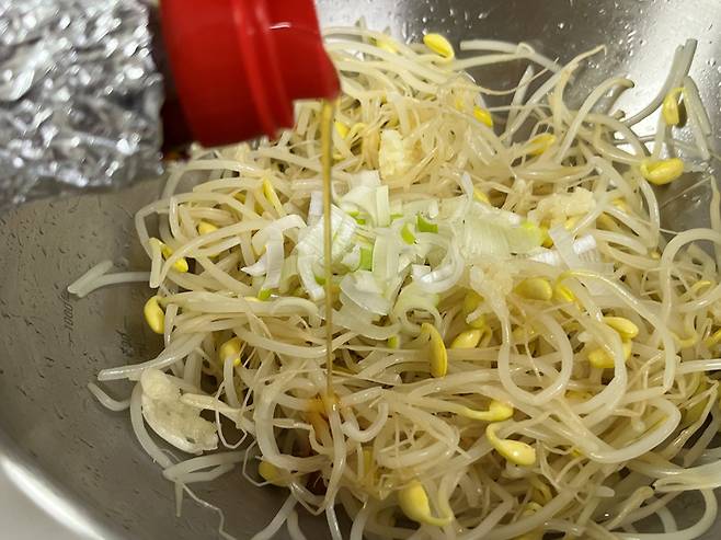 참기름이나 들기름 1스푼 넣어 주세요. 이렇게만 간을 하여 무치면 정말 맛있는 콩나물무침이 됩니다.