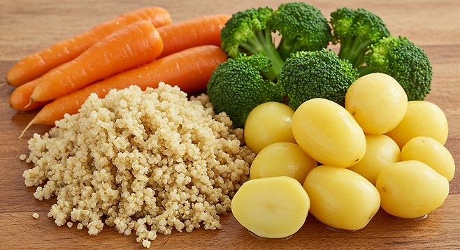 퀴노아는 완전 단백질과 철분이 풍부하여 난소 건강에 도움이 됩니다. 다양한 채소는 비타민과 미네랄을 제공합니다.