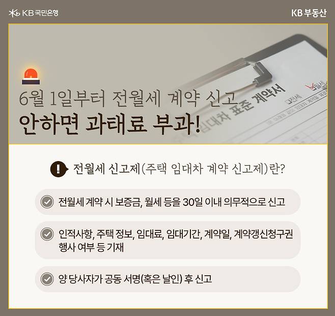 이제 계도기간이 끝나 6월 1일부터는 꼭 전월세 신고를 해야 하고 계약 30일 이내 신고하지 않으면 과태료가 부과됩니다. KB부동산이 전월세 신고제 신고대상부터 신고 방법까지 꼭 알아야 할 내용을 정리해봤습니다.