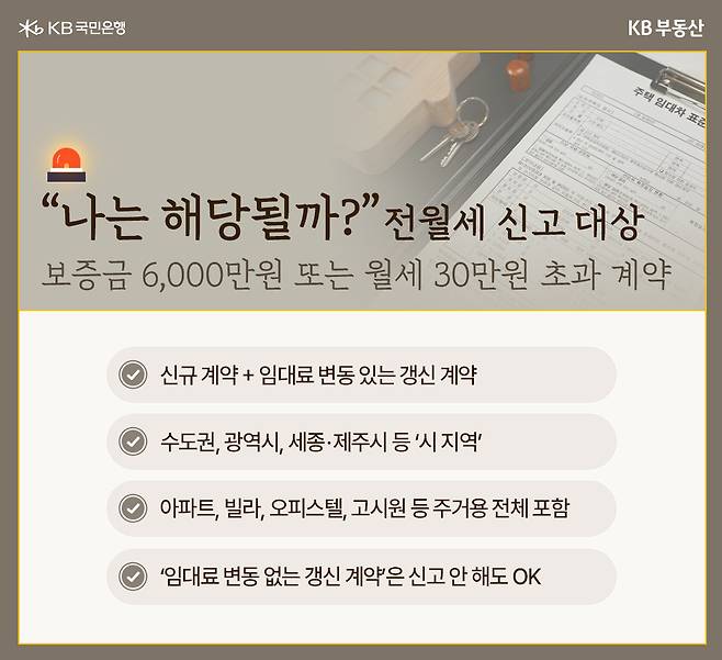 보증금 6,000만원 초과 또는 월세 30만원 초과하는 주택 임대차 계약 신규 계약뿐 아니라, 금액 변경이 있는 갱신 계약도 모두 신고 대상입니다. 단, 임대료 변동이 없는 갱신 계약은 신고 의무가 없습니다.