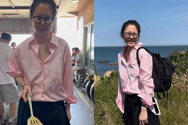 화이트 버튼 셔츠와 핑크 루즈핏 셔츠는 고현정의 이번 여행룩을 대표하는 핵심 아이템이었다.
