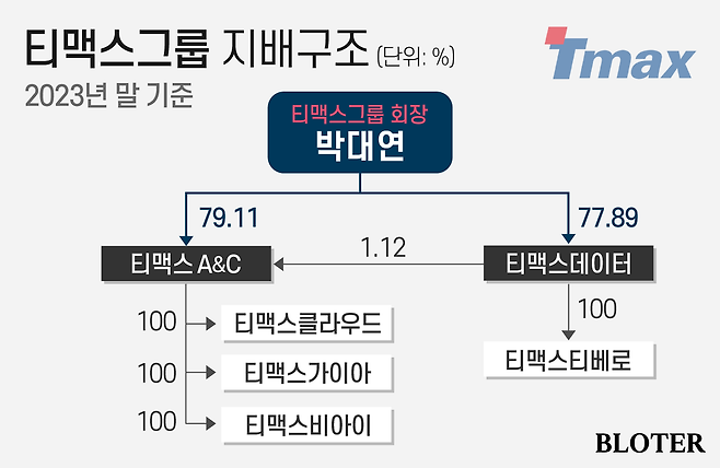 티맥스그룹의 주요 계열사는 티맥스에이앤씨와 티맥스데이터다. 티맥스에이앤씨와 티맥스데이터를 축으로 계열사를 두는 구조다. 지난해 말 기준 박 회장은 티맥스에이앤씨와 티맥스데이터의 지분을 각각 79.11%, 77.89% 보유하고 있다. 박명자·박용연·박삼연 등 박 회장 형제들의 지분까지 합하면 박 회장 일가가 두 회사 지분을 약 80%씩 보유하고 있다. 티맥스소프트를 재인수하며 티맥스데이터에 재무적투자자(FI)가 들어온 만큼 티맥스데이터에 대한 지배력은 이미 떨어졌을 것으로 보인다.