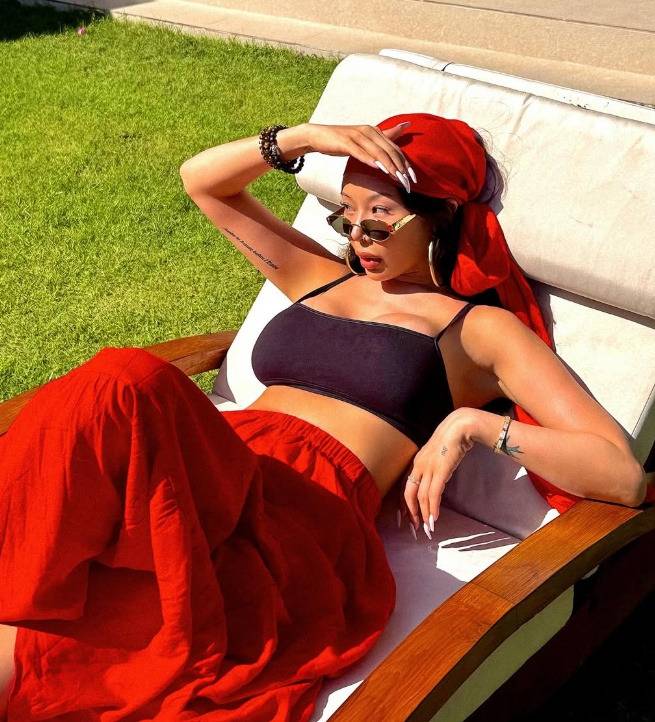 풀사이드에서 촬영된 사진들은 한 폭의 그림과 같습니다. 특히 등과 힙 라인이 아찔하게 드러나는 백뷰 사진은 그녀의 압도적인 실루엣과 꾸준한 자기 관리의 결과를 보여줍니다. 등 라인을 따라 새겨진 커다란 타투는 액세서리 이상의 역할을 하며, 그녀의 자유분방하고 와일드한 매력을 더욱 돋보이게 합니다.