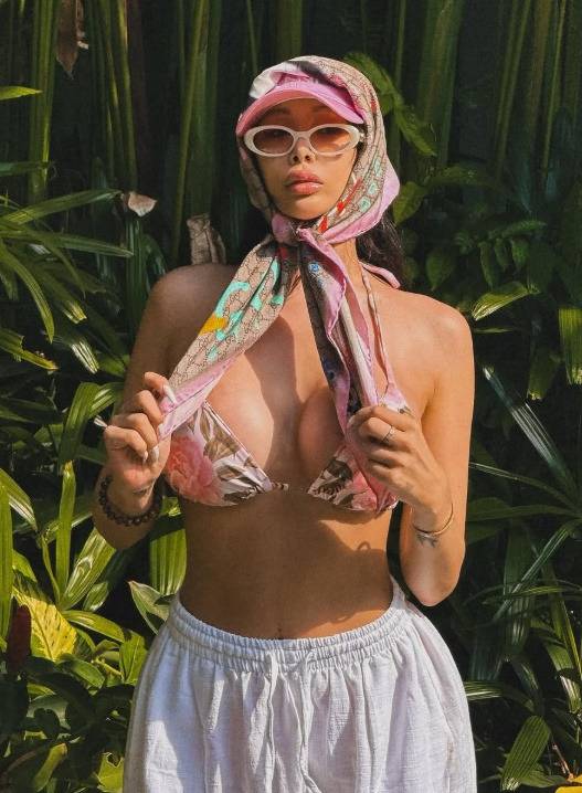 • 과감한 액세서리 매치: 평범함을 거부하는 그녀답게, 비키니에 화이트 프레임 선글라스와 핑크 컬러의 스카프를 두른 볼캡을 레이어드했습니다. 이는 비치웨어에 스트릿 감성을 더하는 신선한 시도로, 제시이기에 가능한 스타일링입니다.