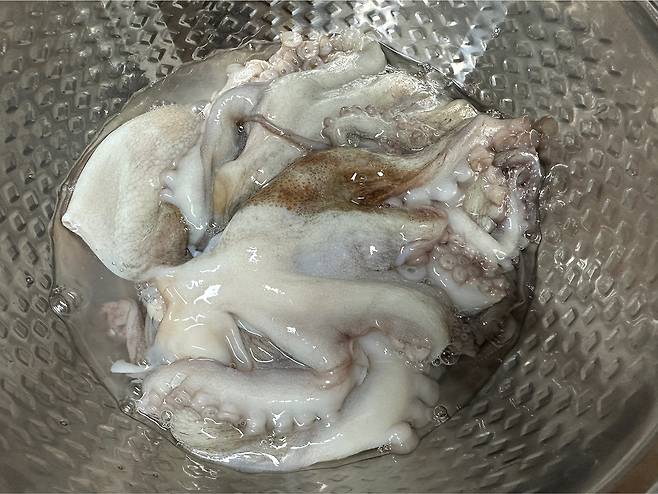 잘 익은 문어는 그릇에 담아 찬물로 씻어 주세요. 열이 식으면서 문어가 더 탱탱해집니다.