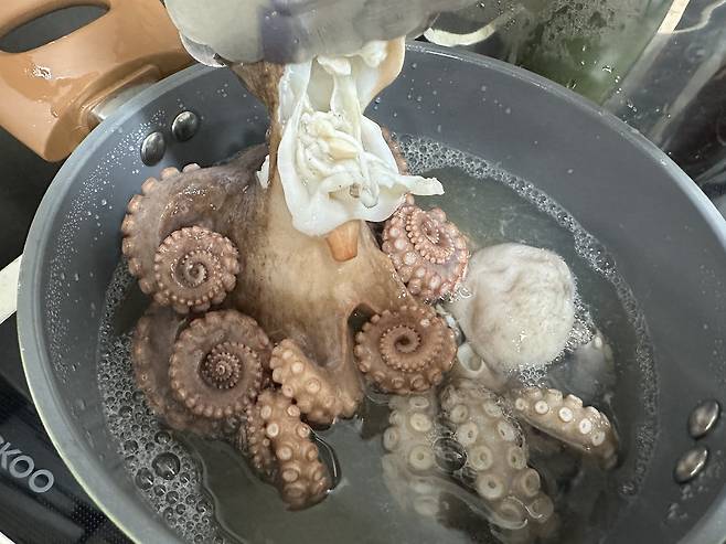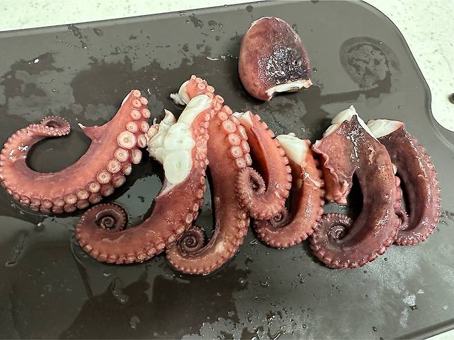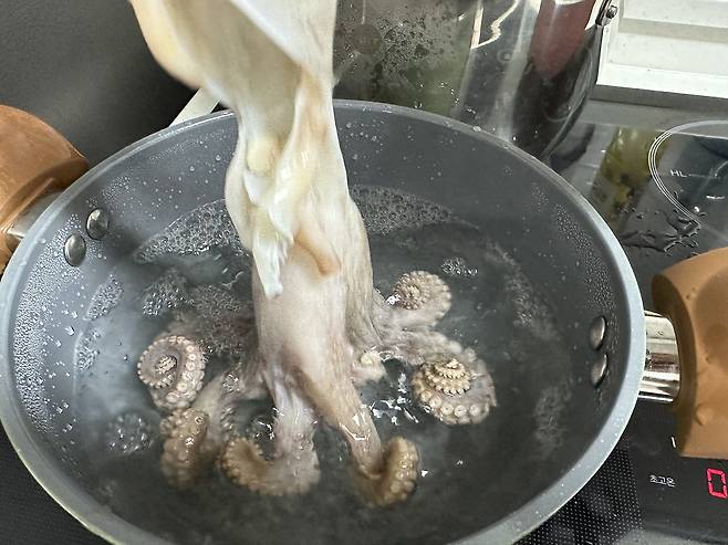 물이 끓으면 문어를 통째로 넣지 말고 다리부터 넣었다 뺏다를 반복하면 문어 모양이 잡힙니다.