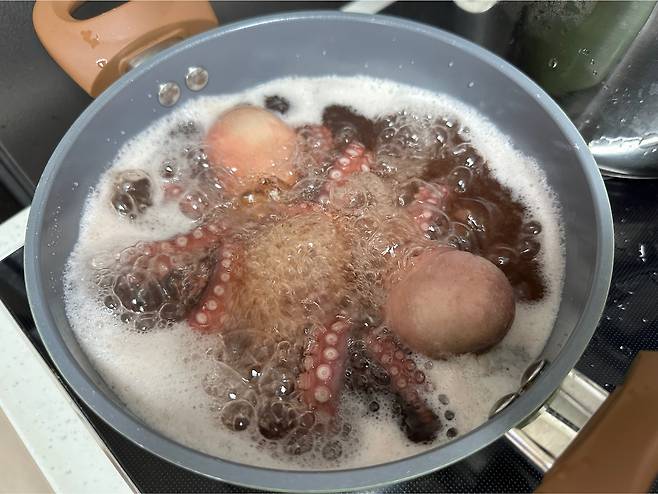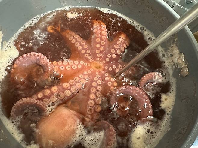 시간이 되면 문어의 다리 중 가장 두꺼운 부분을 젓가락으로 찔러 익었는지 확인합니다. 익지 않으면 미끄덩거리고 너무 익으면 질겨지니 잘 확인 바랍니다.