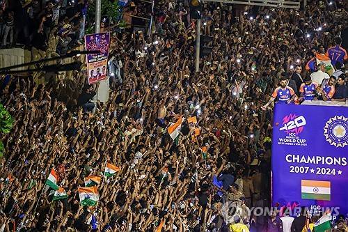 epa11457661 Huge crowd cheer for Team India at marine drive during their victory parade in Mumbai, India, 04 July 2024. Indian cricket team won the T20 World Cup on 29 June 2024. EPA/DIVYAKANT SOLANKI