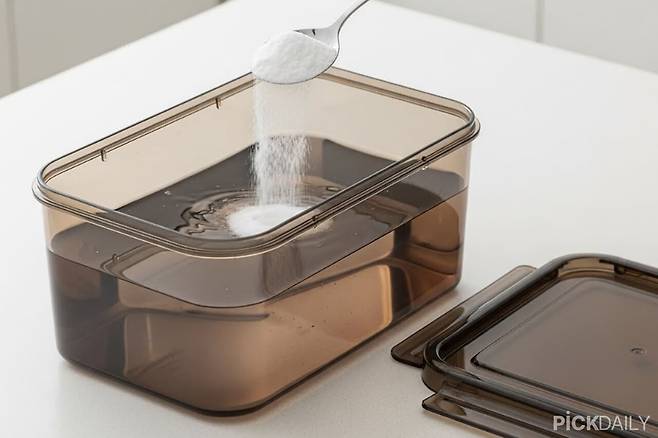 의외의 비법이 하나 더 있다. 바로 설탕물이다. 설탕의 흡착력이 냄새 성분을 끌어당겨 제거하는 원리다. 미지근한 물에 설탕 2~3스푼을 풀고 김치통에 채운다. 30분 정도 둔 뒤 버리고 깨끗이 헹군다. 설탕물은 다른 방법에 비해 세척력이 약하지만, 냄새가 심하지 않을 때 간단히 쓰기 좋다.