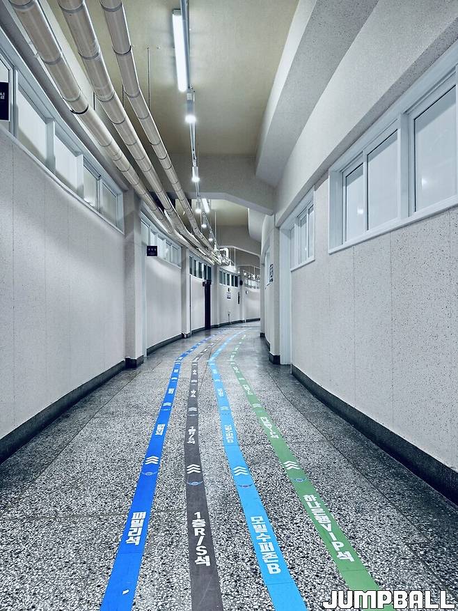 우선 특석 관중들의 이동 경로인 체육관 복도에 레일 조명을 설치하고, 벽과 창문들도 흰색으로 페인트를 새롭게 칠했다. 이 때문에 칙칙함에서 벗어나 굉장히 밝은 분위기로 바뀌었다.