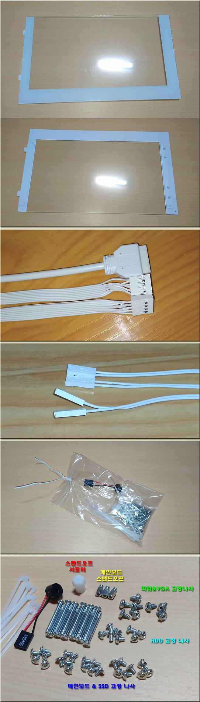 비닐지퍼백엔 케이블타이 10개, 비프음 스피커, 스탠드오프 서포터 1개(특이하게 플라스틱으로 되어 있네요), 메인보드 스탠드오프 3개, 롱스크류 12개, 파워&VGA 고정나사 8개, 메인보드&SSD 고정나사 23개, HDD 고정나사 8개가 들어 있습니다.