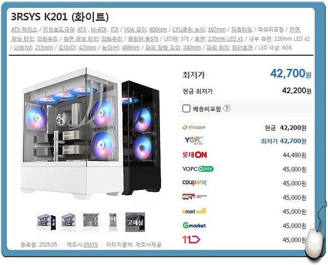 이번에 소개할 제품은 3RSYS K201 (화이트) 컴퓨터케이스로 현재 오픈마켓 최저가는 45,000원이라는 가격대로 형성되어 있습니다.