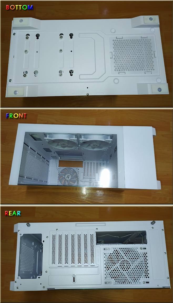 상단 쪽에 120mm 팬 3개 또는 140mm 팬 2개를 추가 장착할 수 있으며, 3열 수냉쿨러 라디에이터를 장착할 수도 있습니다.