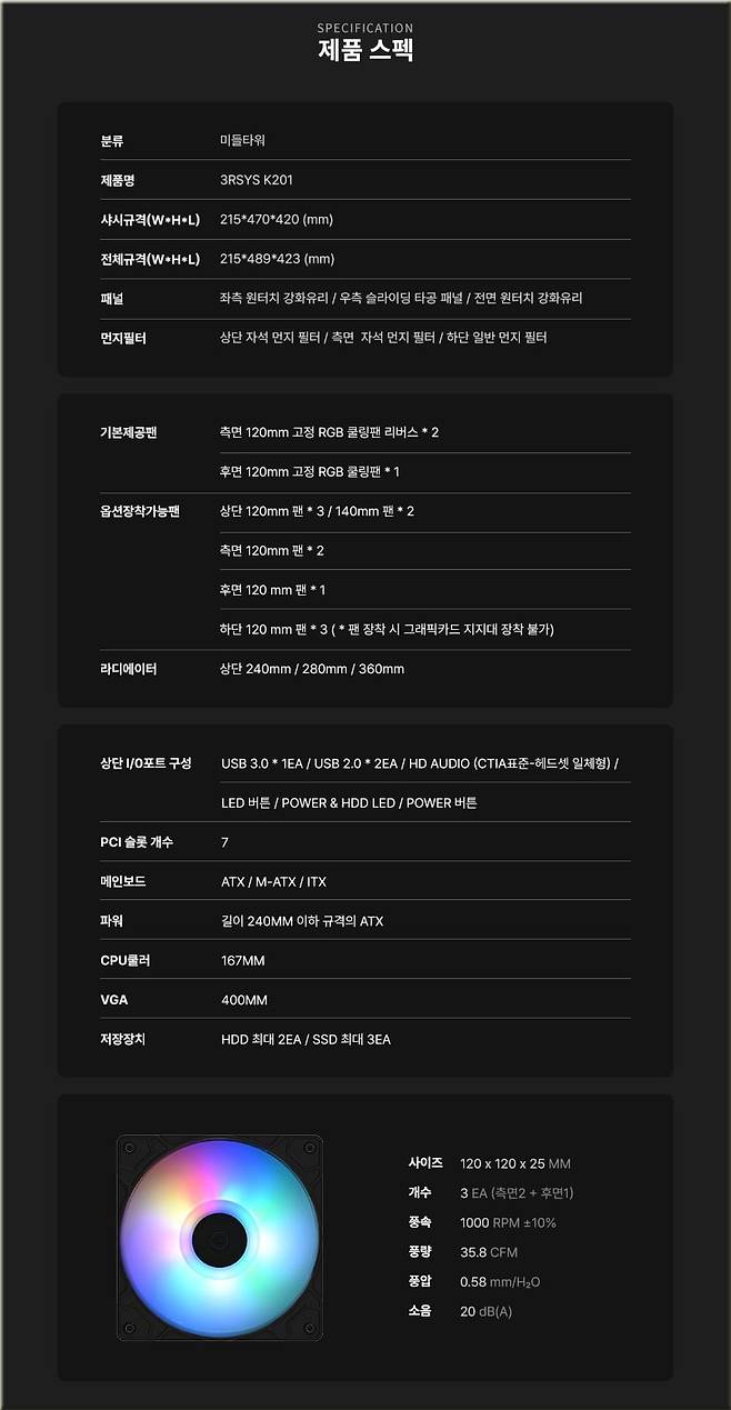 쓰리알시스 K201은 미들타워 케이스로 ATX, M-ATX, ITX 폼팩터 메인보드를 장착할 수 있으며, ATX 규격의 파워서플라이 장착을 지원하는 제품입니다. 전체 크기는 높이 489mm, 넓이 423mm, 폭 215mm이며, 저장 장치로는 HDD 최대 2개, SSD 최대 3개를 장착할 수 있으며, 쿨링팬의 경우 측면에 120mm 2개, 후면에 120mm 1개가 기본 장착되어 있는데, 상단에 120mm 3개 또는 140mm 팬 2개를 파워챔버홀 위에 120mm 팬 3개를 추가 장착할 수 있습니다.