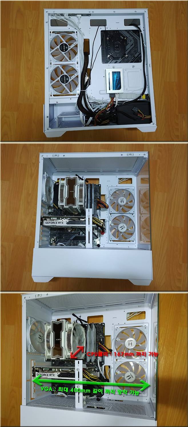 VGA의 경우 최대 400mm 길이 제품까지 호환 가능하며, CPU 쿨러는 167mm 높이 제품까지 설치가 가능합니다.