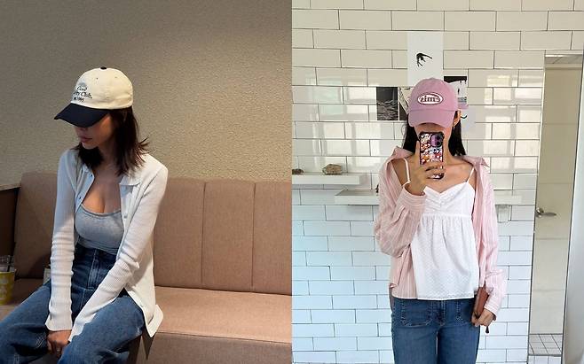 김준희는 야외 햇살 아래 자연과 어우러지는 내추럴한 데님 룩을 선보였다. 라이트 블루 톤의 와이드 데님에 러블리한 핑크 캡과 오프숄더 화이트 블라우스를 매치해 상큼하면서도 여성스러운 분위기를 자아냈다. 특히 블라우스 위에 핑크 셔츠를 자연스럽게 걸친 스타일링은 봄날 피크닉 무드와 찰떡궁합. 여기에 블랙&핑크 나이키 스니커즈로 캐주얼함을 더하며 활동성까지 놓치지 않았다.