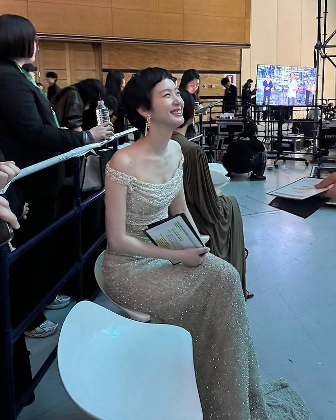 이어지는 오프숄더 드레스는 고급스러운 펄 텍스처가 시선을 사로잡는다. 은은한 아이보리빛과 골드가 섞인 컬러감은 빛을 받을 때마다 미세하게 다른 광택을 보여주며 김고은의 맑은 피부 톤과 조화를 이뤘다. 쇄골과 어깨라인이 드러나는 디자인 덕분에 짧은 숏컷과도 찰떡처럼 어울렸고, 여성스러움과 카리스마를 동시에 잡아냈다.