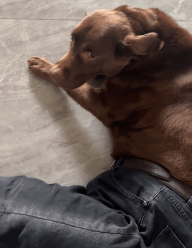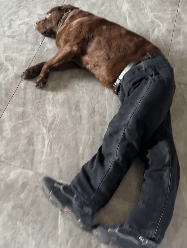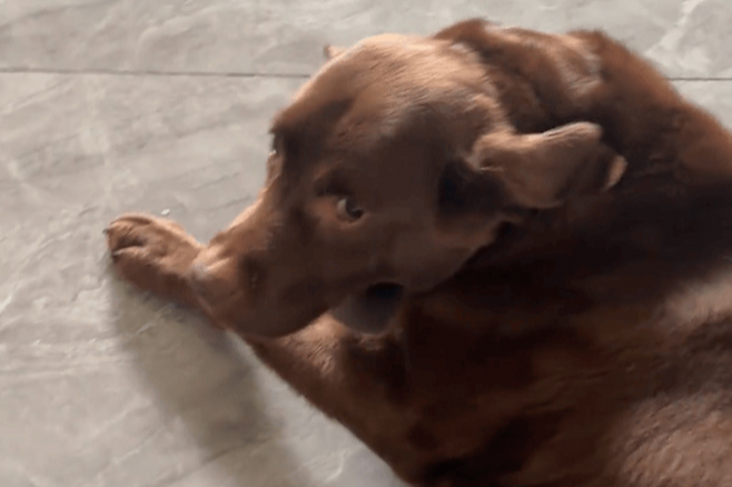 강아지는 아직 상황을 제대로 이해하지 못한 듯 천천히 고개를 젓다가 다시 누워 잠들려 했고, 주인은 터져 나오는 웃음을 억누를 수 없었습니다.