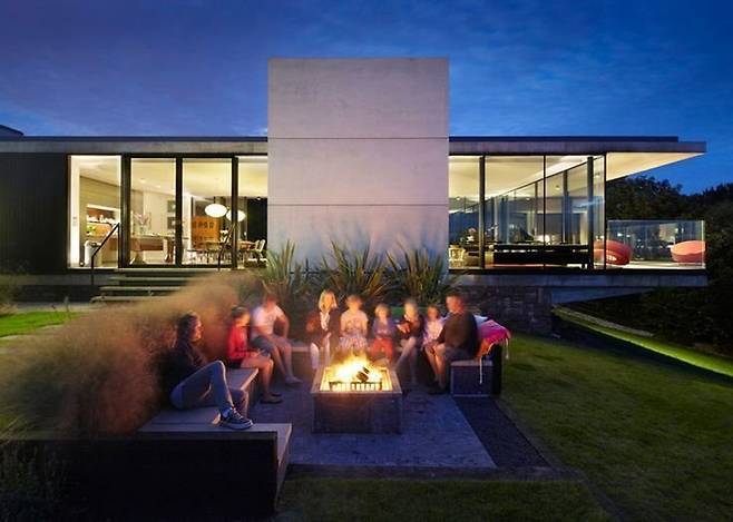 사이즈는 다르겠지만 국내 개인 주택에서 쉽게 적용할 수 있는 디자인이다. 아직 비어 있는 마당이라면 이렇게 콘크리트나 나무를 이용해 의자를 만들고 중앙에 테이블을 겸할 수 있는 난로를 두면 여름과 겨울 모두 무난하게 사용할 수 있다. 연휴 기간 친척 가족들이 모여 함께 이야기를 나누기에 최고의 공간이 될 것이다.