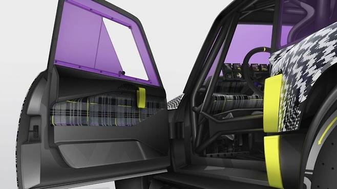 내부는 레이스카에 가까운 디자인으로 탄소 섬유 레이싱 버킷 시트, 안전 하네스가 탑재돼 있고, 노란색의 센터 콘솔을 포인트로 뒀다.