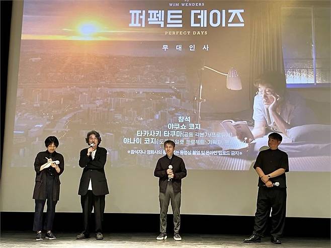 “감독이 절대 발설하지 말라고 했지만 앞선 일정에서 말했고 개봉했으니 괜찮을 거라 생각한다. 노트에는 히라야마의 전사와 화장실 청소부가 되기까지의 과정, 히라야마와 코모레비(Komorebi)의 관계가 자세히 적혀있었다. 태양을 보고 미소 짓는 건 태양이 코모레비를 만들어주는 주체이기도 하지만 구원받았다고 생각하는 존경과 감사의 마음을 담은 연출 같다. <퍼펙트 데이즈>를 다섯 번 보면 이를 이해할 수 있고, 10번 보면 훨씬 더 좋은 영화로 느껴질 것이다”며 N차 관람을 유도했다.