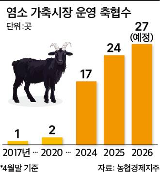 대표적인 것이 염소 가축시장 운영 확대다. 염소 가축시장을 운영하는 축협수는 2017년 1곳, 2020년 2곳에 그쳤지만 2024년 17곳, 2025년 24곳으로 늘었다. 올들어서도 3월26일 전남 영광축산농협, 4월15일 경기 수원축산농협이 문을 열었다. 22일 경북 영천축산농협이 추가로 개장하면 27곳으로 확대된다.