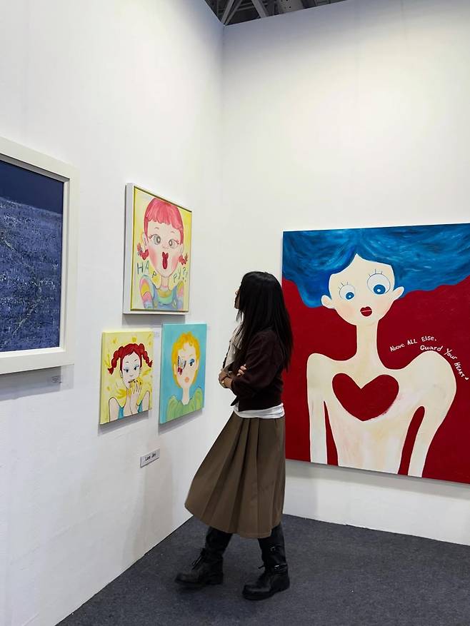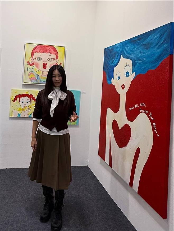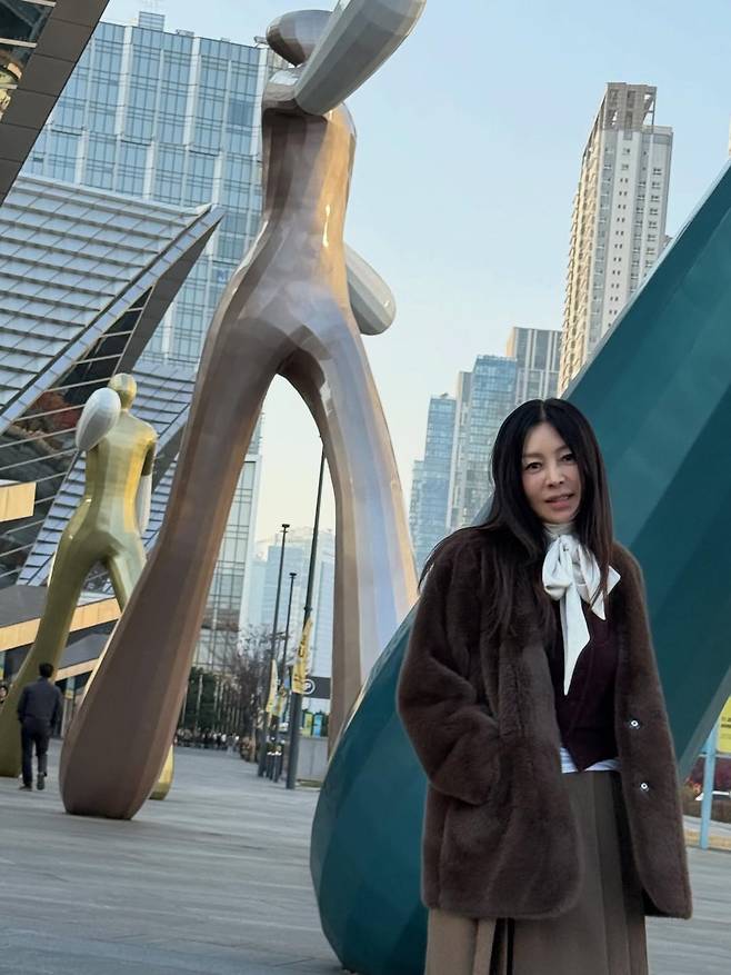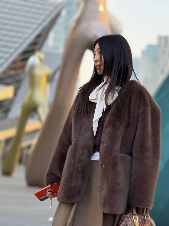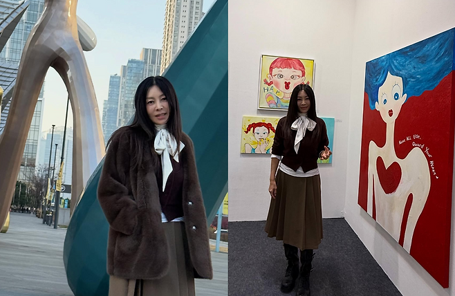 목에 두른 화이트 보우타이가 여성스러움을 더했고, 넉넉한 퍼 코트는 가을 끝자락의 서늘함을 따뜻하게 감쌌다. 실내에서는 화이트 보우 블라우스에 카키 미디 스커트, 블랙 부츠를 신어 지적이면서도 품격 있는 갤러리 룩을 완성했다. 매끈한 생머리와 미니멀한 메이크업은 세련된 동안 미모를 강조했다.