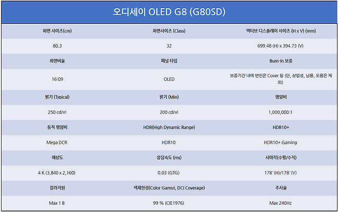 삼성 오디세이 G8에 적용된 4K OLED는 0.1821mm 픽셀 피치로 매우 선명한 화질을 구현합니다. 또한, 0.03ms 응답속도와 240Hz 주사율, 240cd/㎡ 밝기를 제공하면서도 상당히 얇은 베젤을 지원합니다.