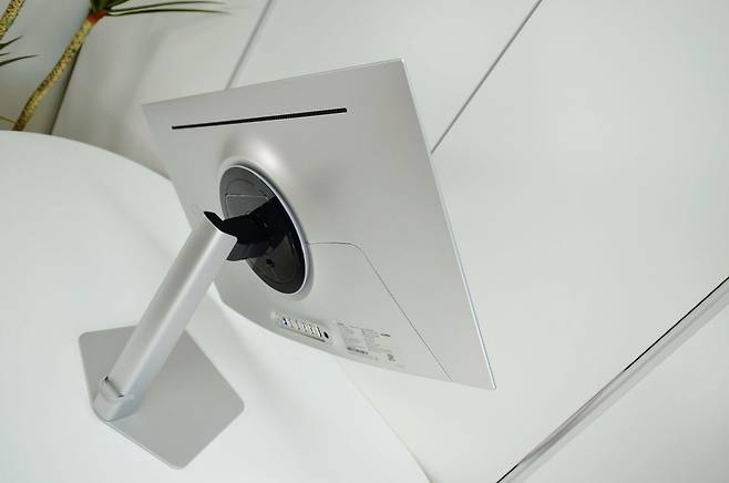 먼저, 스탠드입니다. 스탠드 받침대와 스탠드는 무게가 3.1kg으로 상당히 묵직합니다. 스탠드와 스탠드 받침대 조립은 나사를 조절하는 방식이 아닌 원클릭 방식으로 매우 간편해졌습니다.