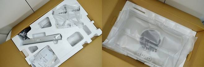 구성품은 상단에는 거치대와 부속품을, 하단에는 모니터를 2층 구조로 안전하게 적재했습니다. 상하단을 거꾸로 개봉하면 모니터를 꺼낼 때 잡는 부분이 없어 주의가 필요합니다.