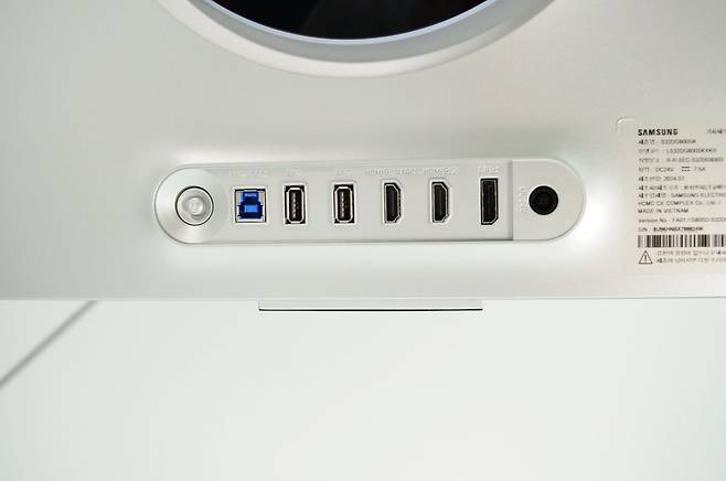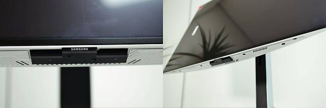 C타입 포트가 없고 DP 포트가 하나라는 점은 아쉽지만, HDMI 2.1 버전과 DP 1.4를 통해 UHD 240Hz를 지원합니다. 좌측과 우측으로 전원 버튼과 전원 입력을 균형 있게 배열하여 디자인의 조화를 잘 반영한 고퀄리티 맞는 배치의 디자인이라 생각됩니다.
