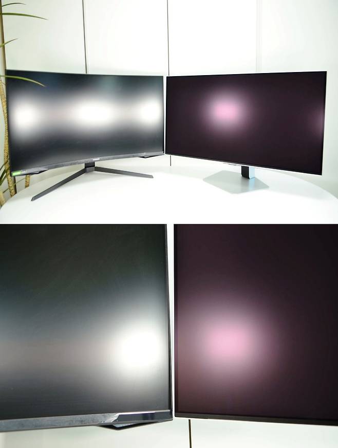 G8(G80SD)에 적용된 글레어 프리는 기존의 G7(LC32G75TQ) 커브드 모니터와 확연한 차이를 보여줍니다. 두 개의 조명을 정면에 비추면 그 차이를 명확히 느낄 수 있습니다.