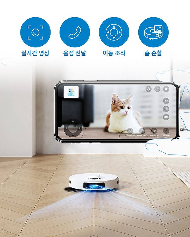 카메라를 활용한 홈캠 모니터링 기능도 추가되었는데, 전용 앱으로 로봇청소기를 조작하면서 실시간으로 화면을 확인하고 음성을 전달할 수 있으며 소프트웨어와 하드웨어 이중 보안으로 사생활 보호에도 더욱 신경 썼다.