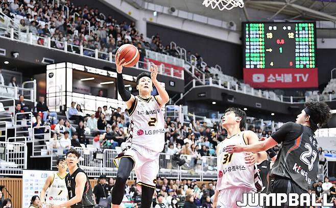 [점프볼=수원/문복주 기자] 9일 수원 KT 소닉붐아레나에서 열린 2024-2025 KCC 프로농구 수원 KT와 창원 LG의 경기, LG 최진수가 순간 돌파로 레이업을 시도하고 있다.