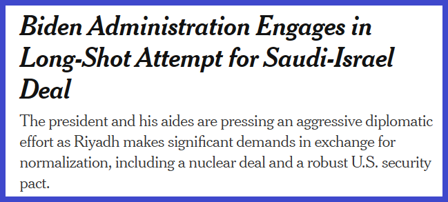 위 기사는 사우디아라비아와 이스라엘 사이를 중재하려는 바이든 행정부의 노력에 대해 다루고 있어. 이 협상이 성공하면 사우디아라비아가 중국 측으로 기우는 것을 막을 수 있다는 점에서 전략적 가치가 있다고 보고 있기 때문이야! 기자는 두 국가가 오랜 견원지간이기 때문에 미국의 중재 시도가 결코 쉽지 않을 것이란 점을 지적하고 있어.
