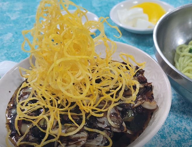 ✔ 강화속노랑간짜장: 고구마칩의 달콤함, 바삭함이 간짜장에 더해져 색다른 식감.강화 사자발약쑥으로 만든 녹색 면이 비주얼까지 책임집니다.