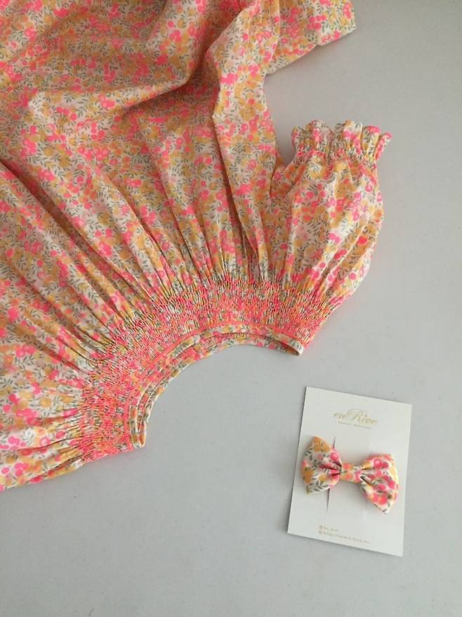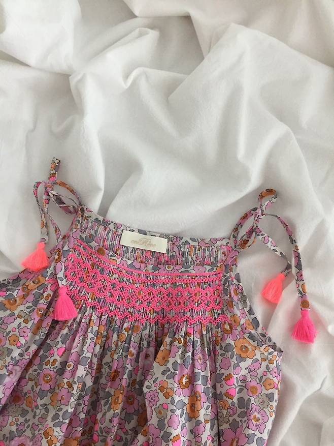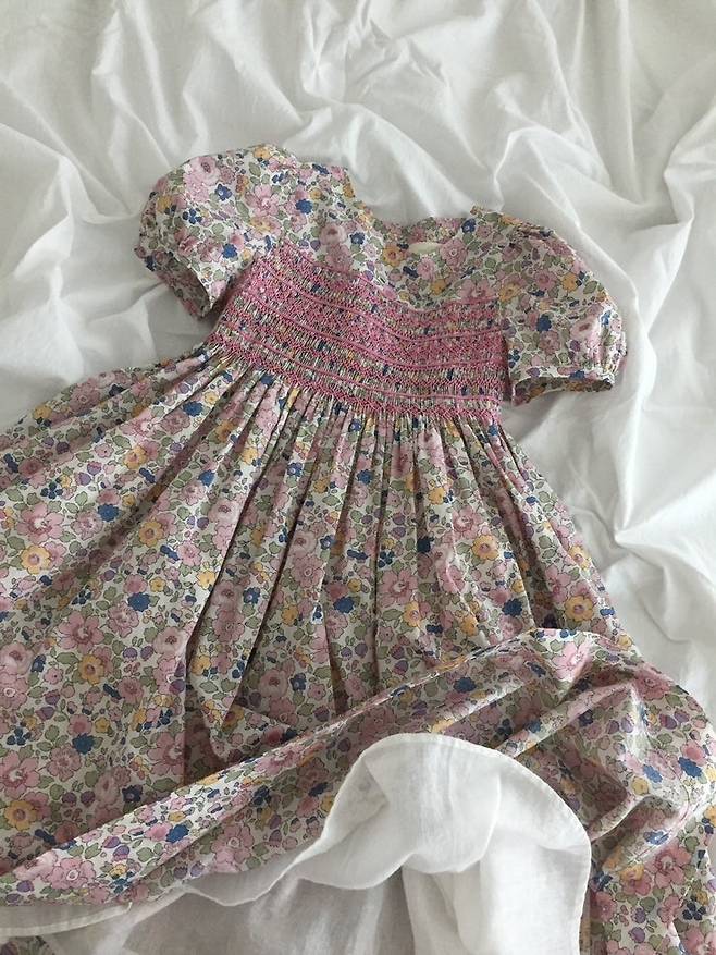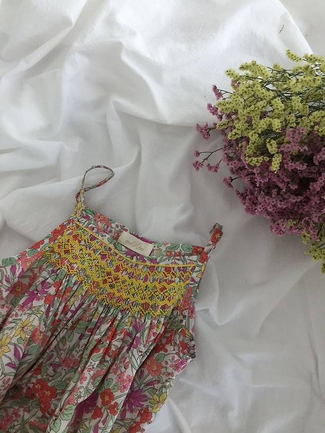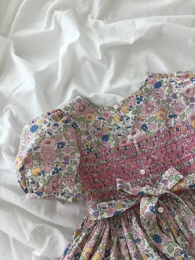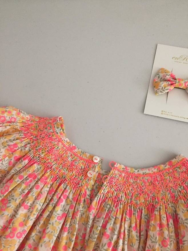 특히 스모킹 자수는 풍성한 주름이 생명인데, 이 주름을 만들기 위해 일반 원피스의 두 배에 달하는 원단이 사용됩니다. 원단 소요량도 많고, 상상 이상의 시간이 걸리기 때문에 공임비를 제대로 계산하자면 차마 입에 담기 어려운 수준입니다. 그래서 돈을 생각하면 결코 만들 수 없는, 그저 좋아서, 내 아이에게 입히고 싶은 사랑으로 만드는 옷이라고 할 수 있습니다.