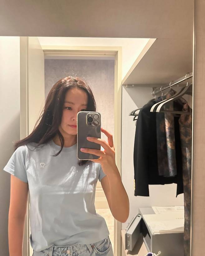 밝은 하늘색 티셔츠와 연청 데님 팬츠를 매치한 모습이다. 티셔츠의 심플한 디자인과 자연스러운 헤어스타일이 편안하면서도 청량한 이미지를 강조한다. 데일리룩으로 손색없는 조합으로, 실용성과 스타일을 동시에 잡았다.