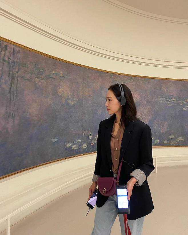 브라운 셔츠에 블랙 오버핏 블레이저, 연청 데님 팬츠를 매치해 시크하면서도 트렌디한 무드를 연출하고 있다. 와인 컬러 크로스백과 헤드셋 등 소품 활용이 돋보이며, 격식과 자유로움이 공존하는 도시적인 스타일을 완성했다.