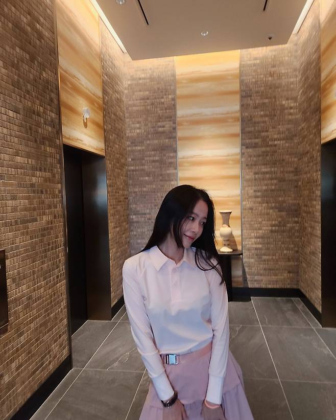 홍수현은 밝은 핑크 셔츠와 같은 계열의 스커트를 매치하여 전체적으로 부드럽고 여성스러운 분위기를 연출하고 있다. 셔츠의 단정한 카라와 심플한 디자인이 고급스러움을 더하며, 허리 벨트로 실루엣을 강조해 세련된 오피스룩의 정석을 보여준다.