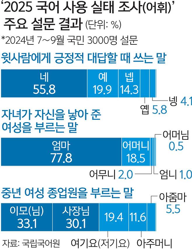 세대, 성별, 지역, 계층 등 사회적·지역적 변인에 따른 어휘 사용 실태를 파악하기 위한 이번 조사에서 '윗사람의 질문에 긍정적으로 대답할 때 쓰는 말'에 대해 국민 전체적으로는 '네'가 55.8%, '예'가 19.9%, '넵'이 14.3%, '옙'이 5.8%, '넹'이 4.1% 순이었다.