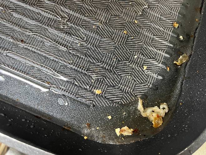 팬에 남은 삼겹살 기름은 키친타월로 닦아 내기에는 한계가 있습니다. 그러기에는 너무 많은 양의 키친타월이 필요하죠.