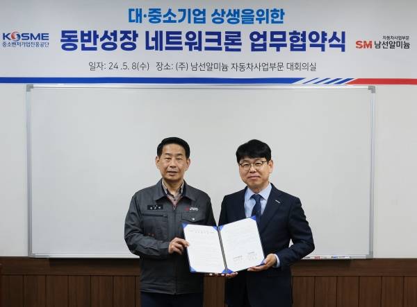 SM그룹(회장 우오현) 제조부문 계열사 남선알미늄 자동차사업부문이 중소벤처기업진흥공단(이하 중진공)과 동반성장 네트워크론을 지원하기 위한 업무협약을 체결했다고 10일 밝혔다.