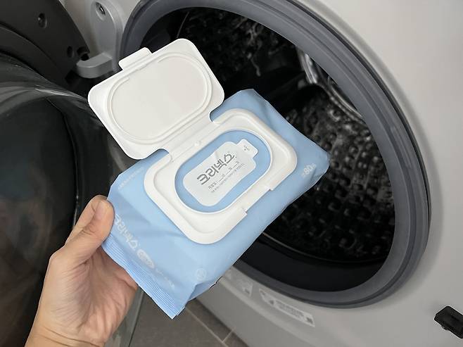 물티슈를 넣으면 세탁 중 발생한 실밥, 먼지, 보풀 조각을 대신 흡수해 옷에 다시 붙는 현상이 줄어들어요.