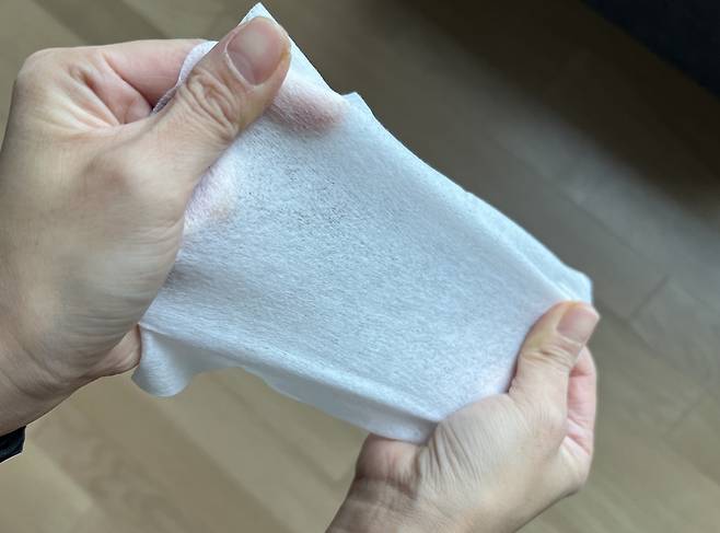 반드시 도톰하고 질긴 제품을 사용해야 하고 사용하기 전 물티슈 한 장은 양손으로 당겨 보아 찢어지는지 확인해 보세요.