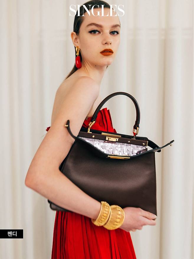 펜디는 내면의 아름다움을 투영한 피카부 이너 뷰티 백을 선보였다. 파예트, 비즈, 스터드, 크리스털 장식이 어우러진 내부 디테일로 경쾌한 무드를 강조한 모습이다.
