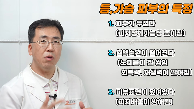 등과 가슴은 피부가 두꺼움 피부가 두꺼우면 피지가 막힐 확률이 높기 때문에 여드름 발생 확률도 높아짐