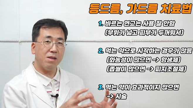 부위가 넓고 피부층이 두꺼워서 연고를 발라도 흡수가 잘 안됨 따라서 바르는 연고는 실효성이 떨어짐 꼭 그런 건 아니고 일반적인 경향이 그렇다 연고만으로도 충분한 경우도 있음
